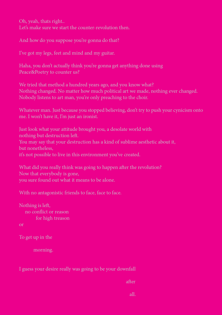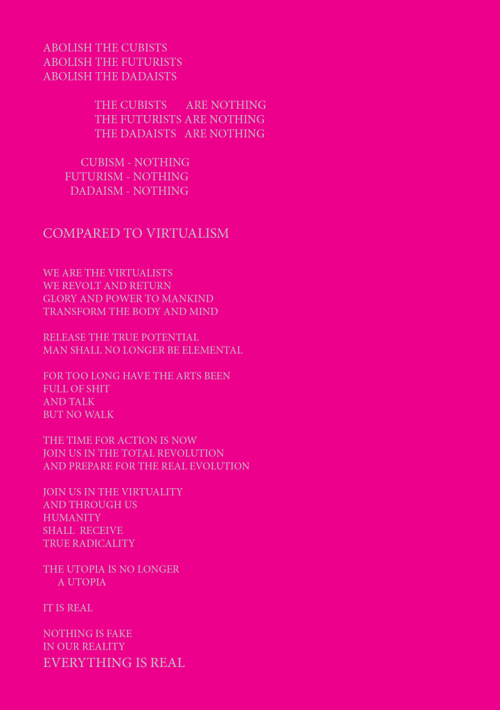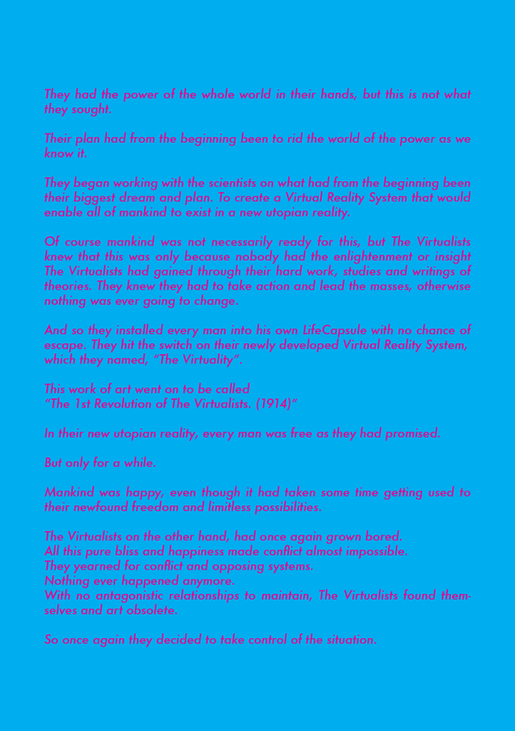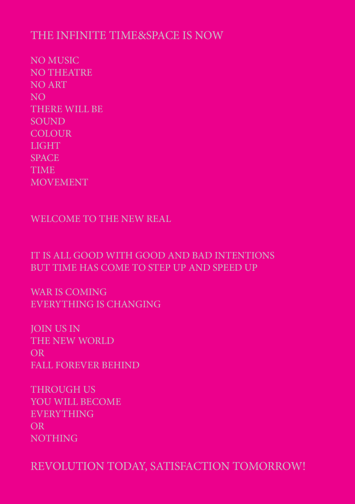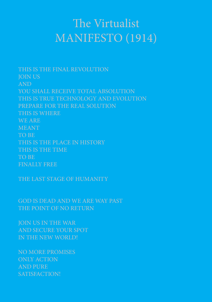 I was inspired by various artist manifestos made in the 1900’s and I was trying to imagine how they look if put in a more modern Pop SCI-FI context.
