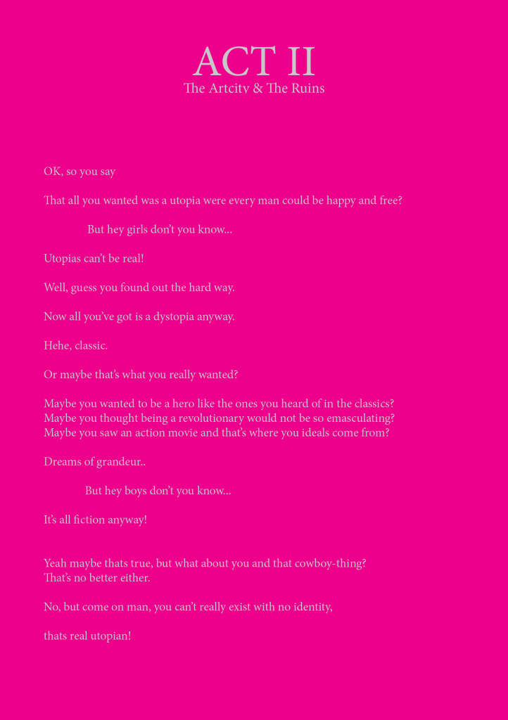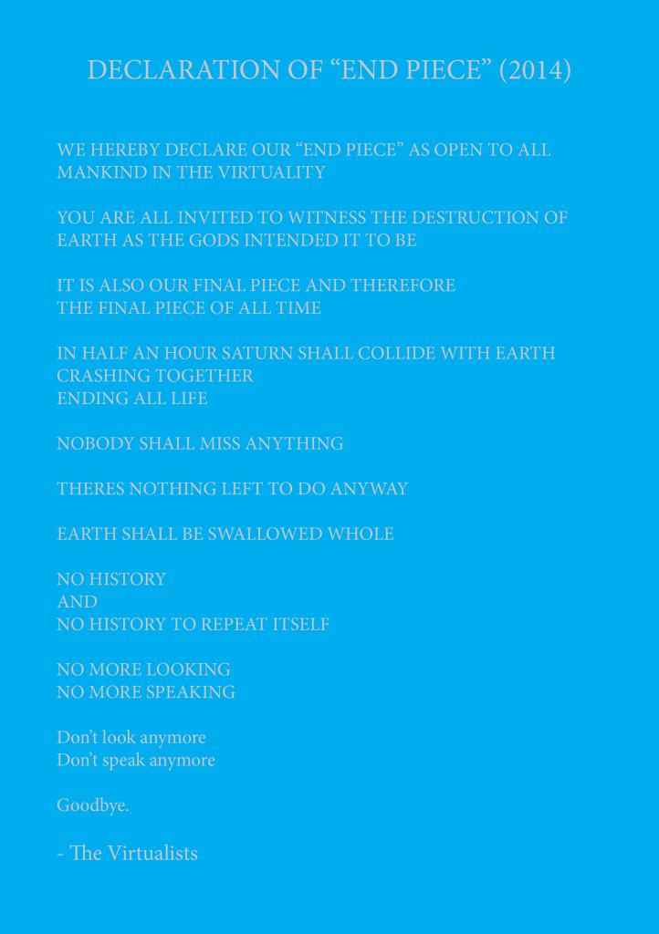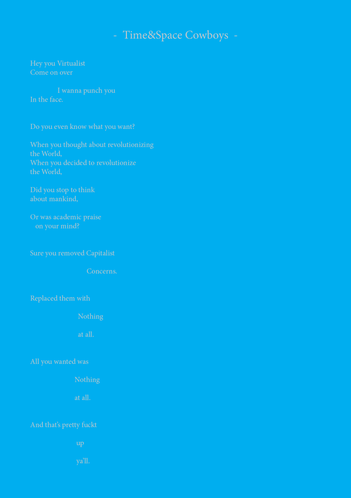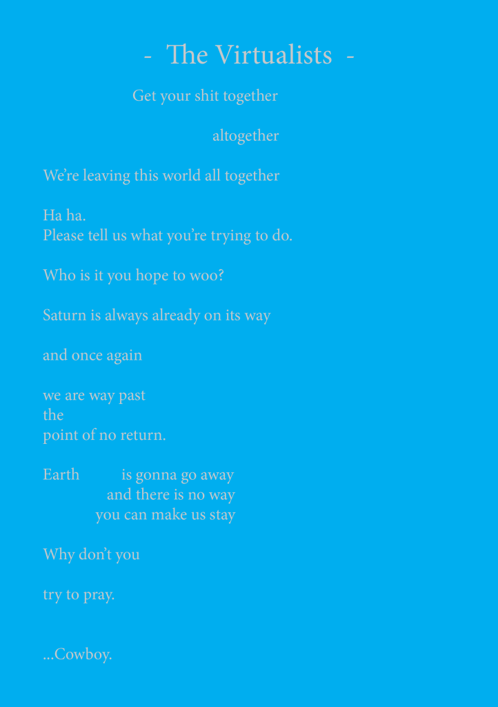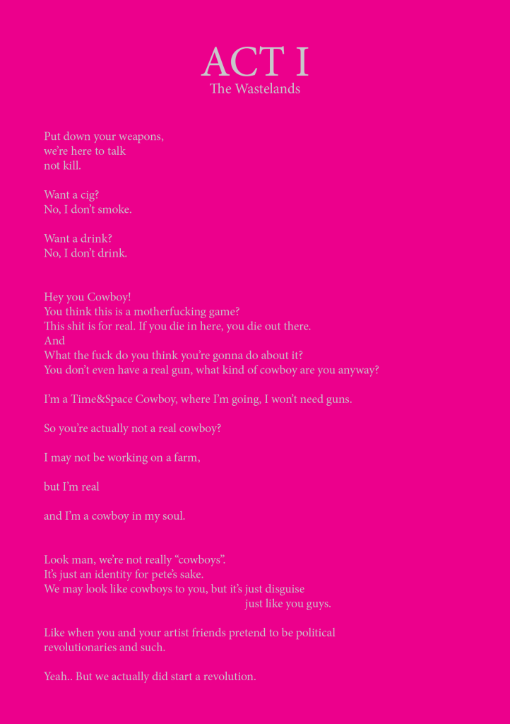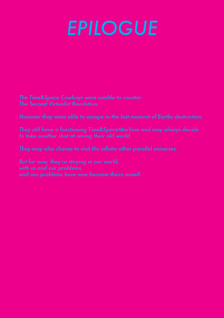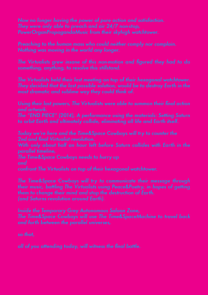 Time & Space Cowboys is a piece about the rebel cowboys and their quest to squelch the artists “The Virtualists” revolution and final work “END PIECE”, their wish to destroy Earth by making it collide with Saturn.
