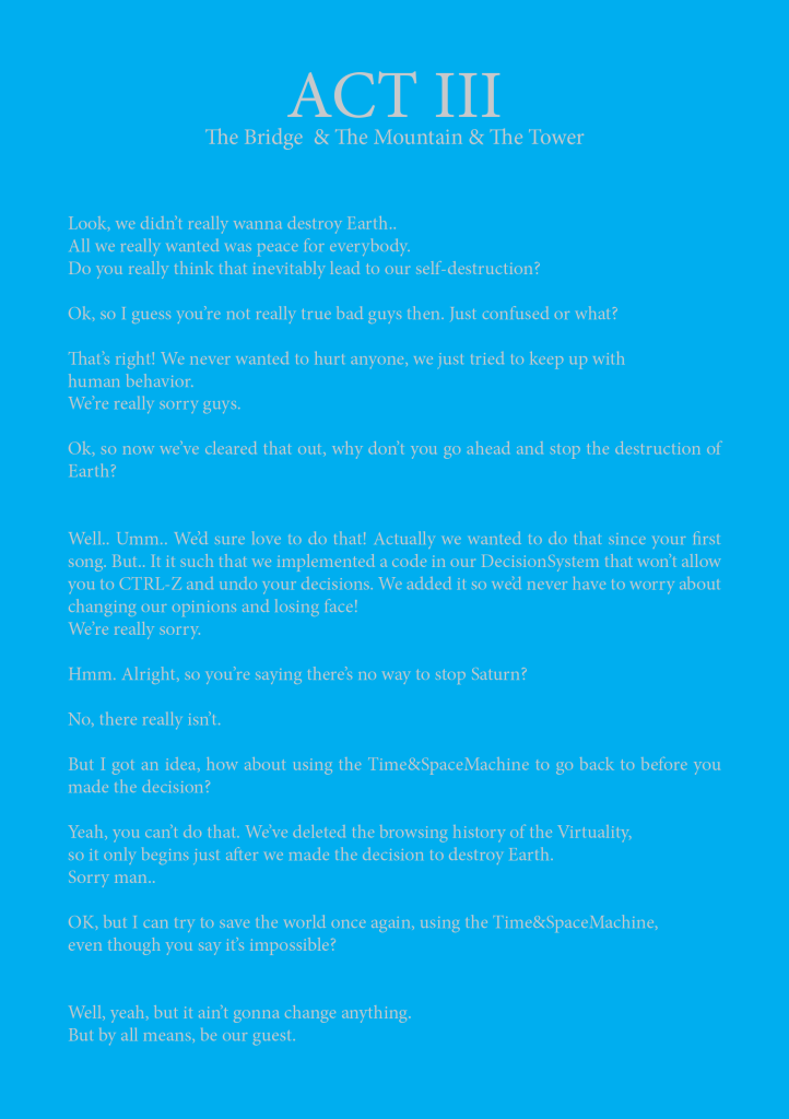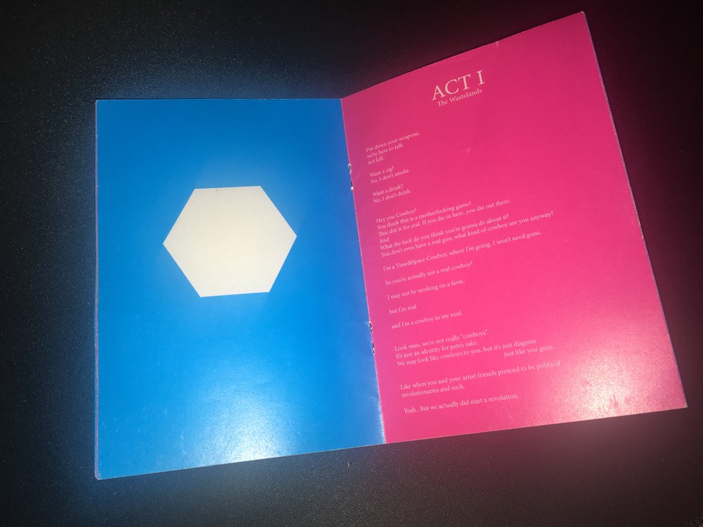 The performance was seperated into three pieces intertwining, a concert, a playthrough of a virtual world and a booklet containing the narrative.